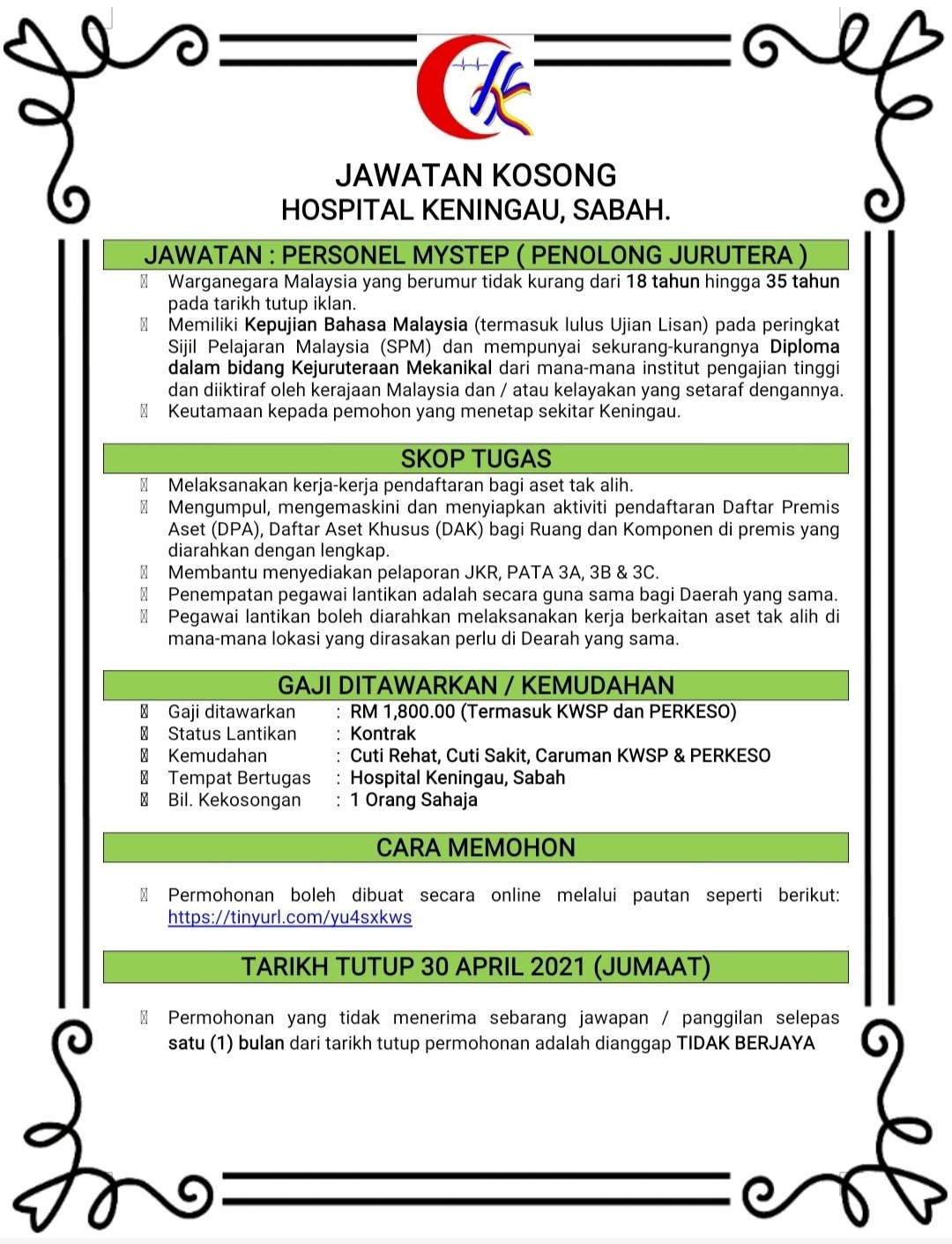 Panglimaaa Kerjaya On Twitter Hospital Keningau Sabah Jawatan Kosong Terkini Adalah Seperti Berikut 1 Personel Mystep Penolong Jurutera Rt And Spread It Twt Sabah Twtkerjakosongg Empayarkerjaya Kerjakosongg My Mypostgraduate Twt Mkhcareer